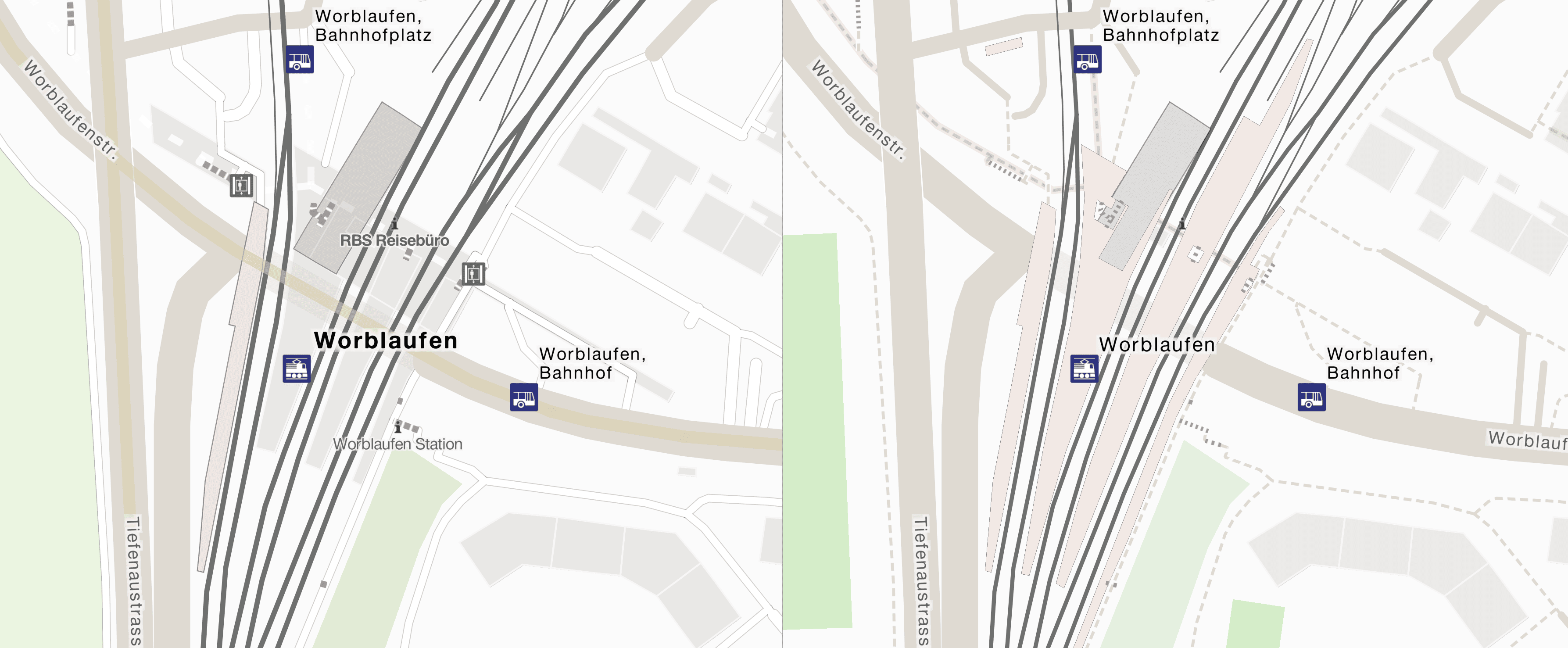 Am Beispiel Worblaufen sind die Verbesserungen vom alten (links) zum neuen Kartenbild (rechts) gut erkennbar.