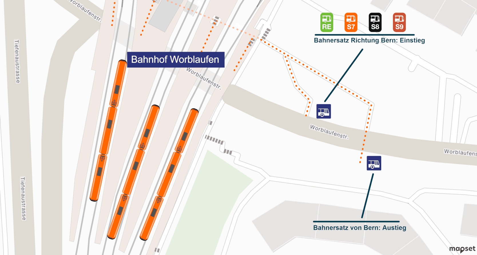 Obwohl es gerade ein grosser Vorteil von mapset ist, dass damit erstellt Pläne ein einheitliches Erscheinungsbild haben, hatten einige Kunden den Wunsch, ihre eigenen Piktogramme und Schriften in mapset zu verwenden. Neu besteht daher die Möglichkeit, für Kunden ein eigenes Corporate Design zu integrieren. Für den RBS und die VBZ haben wir bereits entsprechende Anpassungen vorgenommen. Die Abbildung zeigt ein Beispiel eines Bahnersatzplans von Worblaufen, in dem die speziellen Linienpiktogramme des RBS in mapset übernommen wurden. Sichtbar ist auch, dass im Rahmen des Corporate Designs Bilder in die mapset-Pläne integriert werden können, im Beispiel sind es Schema-Bilder von RBS-Zügen.